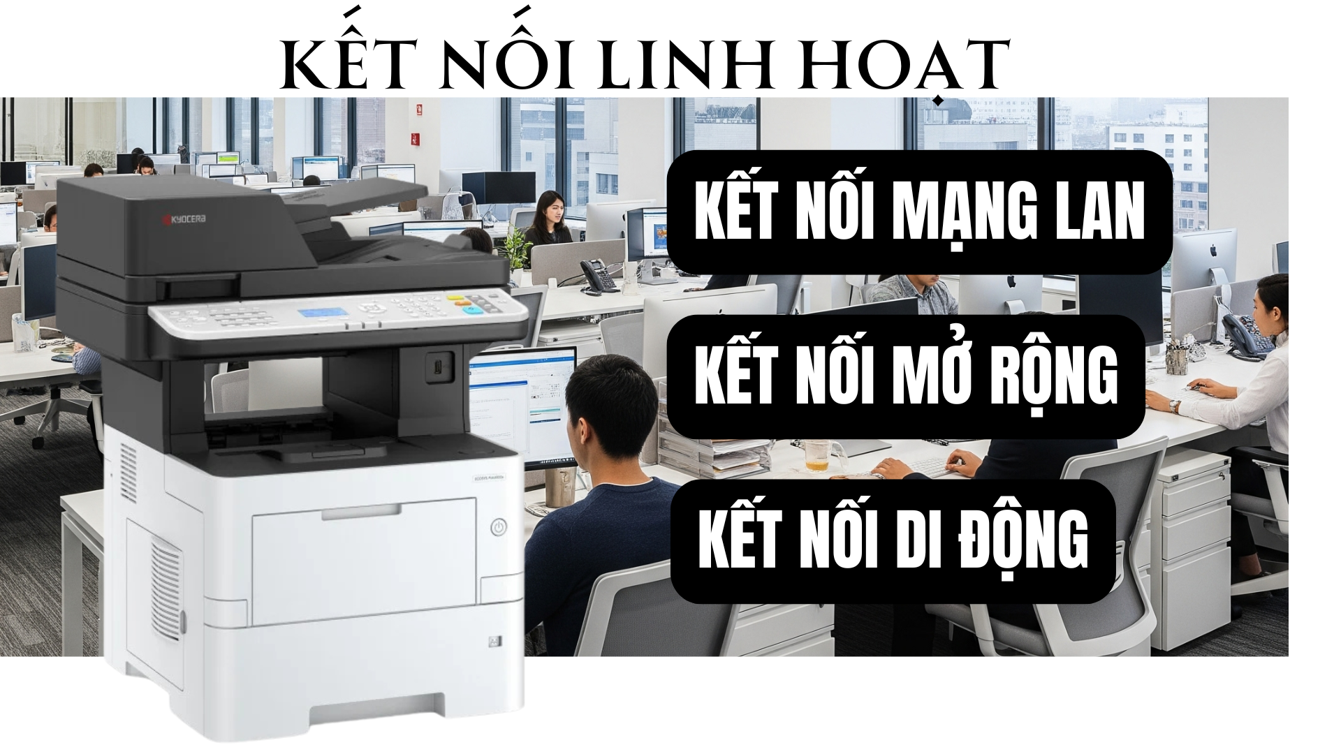 Trong kỷ nguyên số, khả năng kết nối linh hoạt là một yêu cầu không thể thiếu. KYOCERA MA4500x đáp ứng hoàn hảo với các tùy chọn kết nối đa dạng: